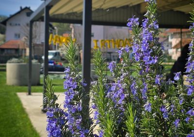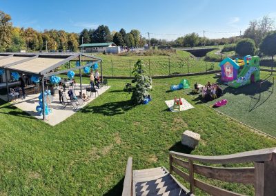 Napravili smo mjesto za zabavu i opuštanje. Na 2000m2 nalazi se pergola od 150m2 sa sanitarnim čvorom, kupaonicom i otvorenom kuhinjom sa velikom pečenjarom za roštilje i peke, i hladnjakom. Tu je veliki stol za jelo od 6 metara za 30ak odraslih ljudi, šank za ekipu koja voli stajati uz roštilj, i kutak za malu djecu